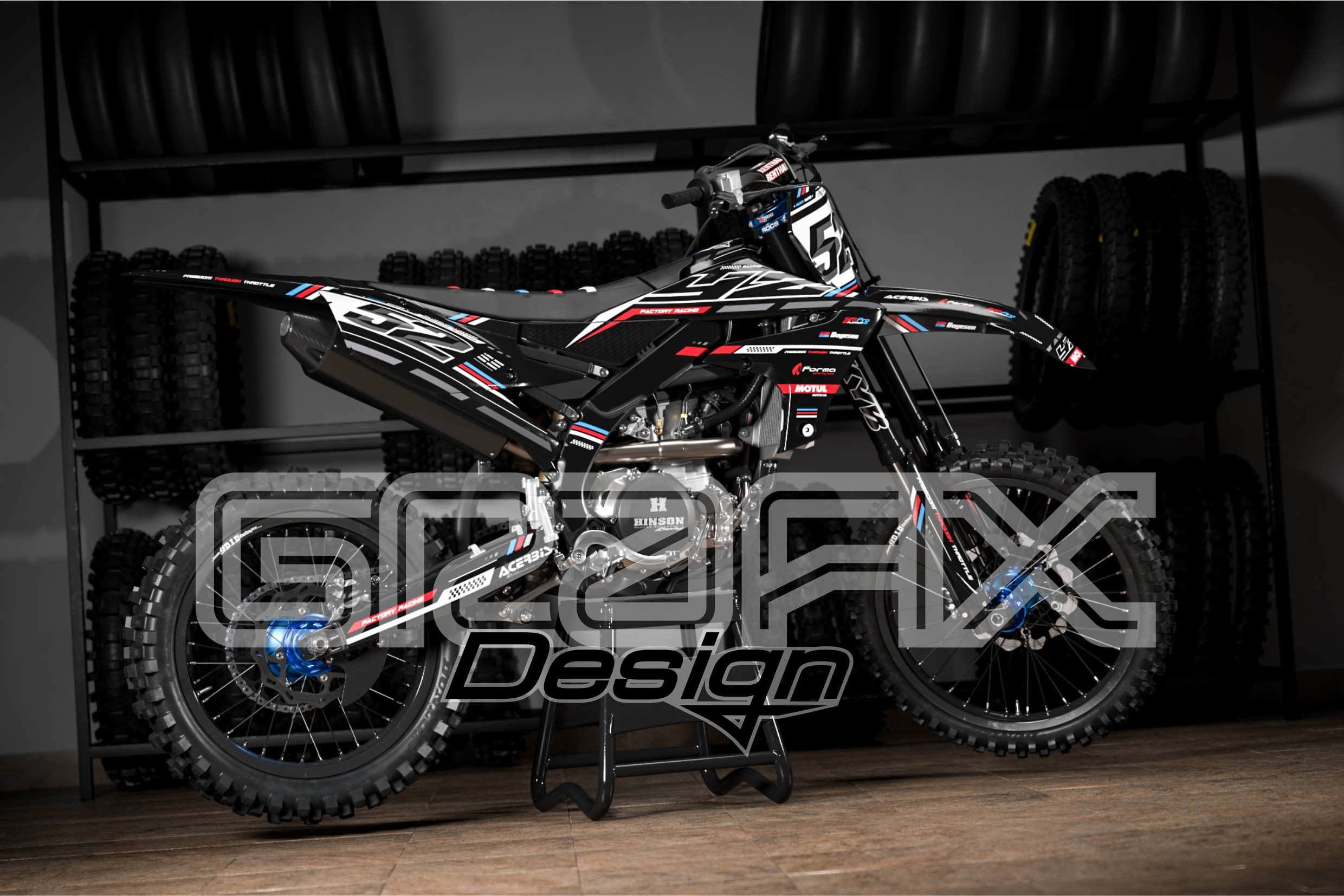 Dekorkit bestehend aus: Kühlerspoiler, Kotflügel vorne und hinten, Filterkasten, Gabelschutz und Schwingen. Nummernfolien bestehend aus: Startnummerntafel vorne, Seitenverkleidung links und rechts. Nummernfolien sind im Dekorkit nicht enthalten, Aufgrund der verschiedenen Variationen müssen diese extra aktiviert werden.