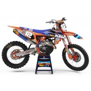 Dekorkit von Grafixdesign bestehend aus: Kühlerspoiler, Kotflügel vorne und hinten, Gabelschutz und Schwingen. Nummernfolien bestehend aus: Startnummerntafel vorne, Seitenverkleidung links und rechts. Nummernfolien sind im Dekorkit nicht enthalten, Aufgrund der verschiedenen Variationen müssen diese extra aktiviert werden. Mehr erfahren